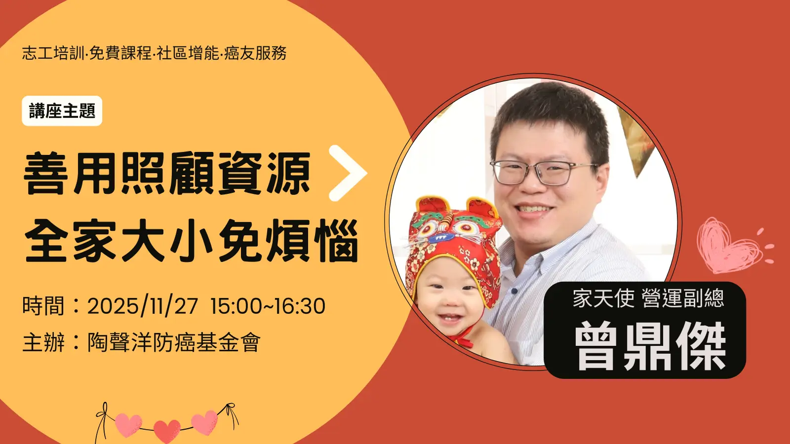首頁志工活動善用照顧資源,全家大小免煩惱 114/11/27 志工活動活動資訊 善用照顧資源,全家大小免煩惱 114/11/27 2025-10-30 637 LINEFacebookLinkedinCopy URL 家裡有老人或病人時,分身乏術嗎?政府有許多照顧資源,要獲得最完整的知識,聽完這堂課就對了。 講題:善用照顧資源,全家大小免煩惱時間:114年11月27日(四)下午3點至4點半地點:陶聲洋防癌基金會防癌講堂(台北市大安區羅斯福路三段277號4樓)主講人:家天使營運副總 曾鼎傑老師 立即報名 善用照顧資源,全家大小免煩惱 (#50)參加人姓名Email聯絡電話身分別一般民眾癌友癌友親屬有家族史陶聲洋志工其他單位志工廠商感興趣的內容選擇感興趣的內容乳癌肺癌大腸癌胃癌肝癌其他癌症預防癌症廠商優惠提問與備註送出報名資訊 home熱烈報名中 LINEFacebookLinkedinCopy URL 前一篇文章114/10/26亞太腫瘤消融年會下一篇文章胺基酸與癌細胞: 破解代謝密碼的防癌關鍵 114/12/11 相關內容 用影像傳愛, 紀錄生命的溫度 114/12/18 志工活動 cathy sydao - 1.認識美圖秀秀影片功能:人人都能當導演 2.圖片+音樂=感動影片的秘密公式 3.三步驟做出「感動故事短片」 4.上字幕、配音、加LOGO,一次搞懂 5.上傳分享:讓愛的故事傳得更遠 胺基酸與癌細胞: 破解代謝密碼的防癌關鍵 114/12/11 志工活動 cathy sydao - 1️⃣ 前言:癌細胞有「食物偏好」? 2️⃣ 胺基酸與人體免疫、修復、能量的角色 3️⃣ 癌細胞獨特的「胺基酸需求」 4️⃣ 胺基酸、免疫、癌症治療的連結 5️⃣ 實用防癌飲食原則 最新防癌資訊 用影像傳愛, 紀錄生命的溫度 114/12/18 志工活動 胺基酸與癌細胞: 破解代謝密碼的防癌關鍵 114/12/11 志工活動 114/10/26亞太腫瘤消融年會 志工花絮 114/10/26交換禮物電影包場-公館百老匯 志工花絮 114/10/25防癌無毒無創新選擇-AI精準檢測與再生醫療 – 唐稚超董事長 講座花絮