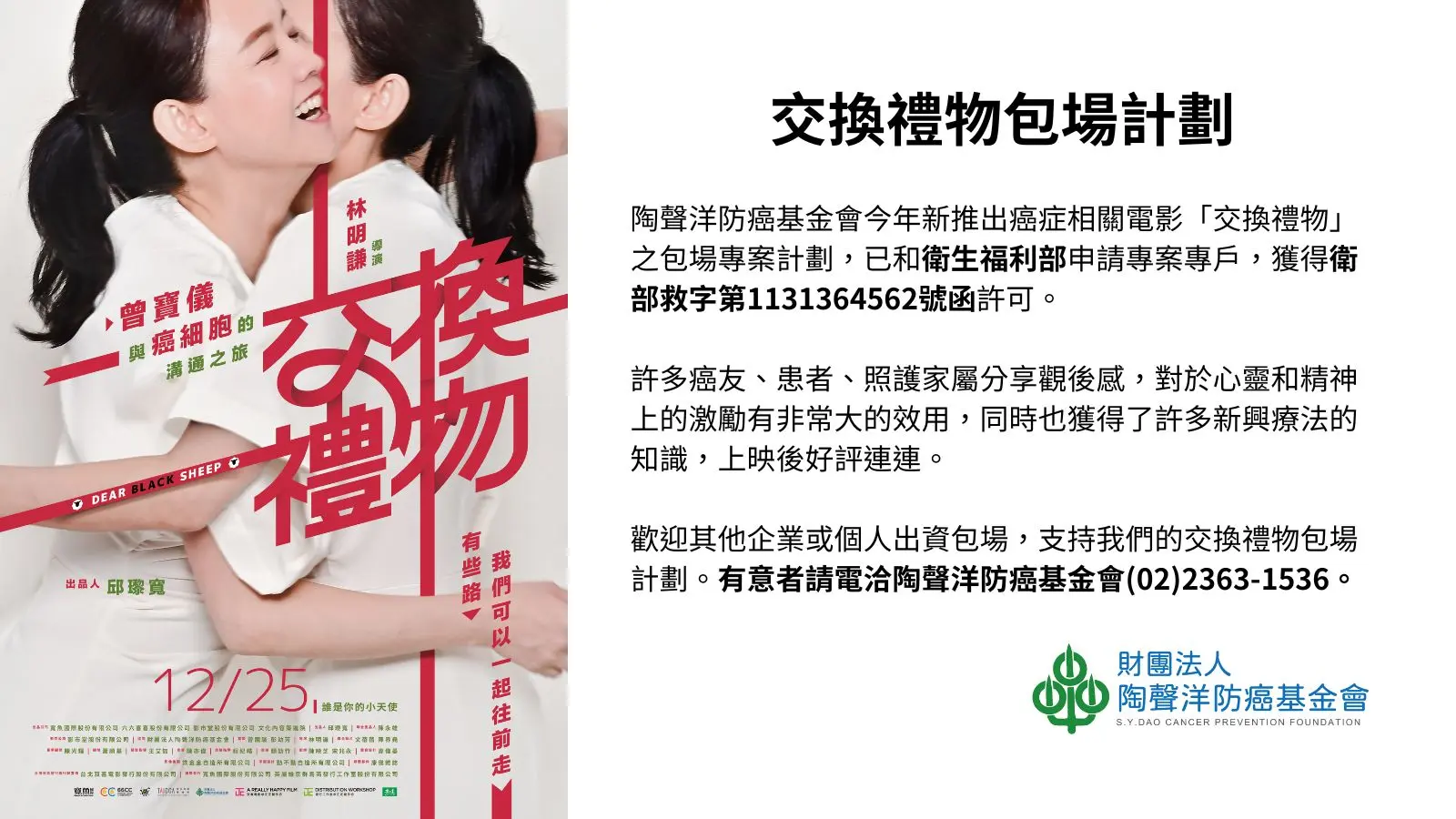 陶聲洋防癌基金會今年新推出癌症相關電影「交換禮物」之包場專案計劃,已和衛生福利部申請專案專戶,獲得衛部救字第1131364562號函許可。
