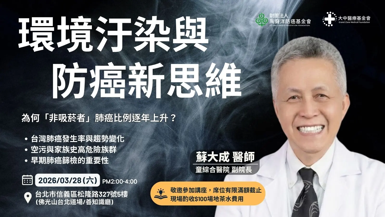 首頁防癌演講環境汙染與防癌新思維 - 蘇大成醫師 防癌演講報名資訊 環境汙染與防癌新思維 – 蘇大成醫師 2026-03-04 738 LINEFacebookLinkedinCopy URL 《癌症健康講座活動》 ✅台灣肺癌發生率與趨勢變化✅空污與家族史高危險族群✅早期肺癌篩檢的重要性 📖主題:環境汙染與防癌新思維👨⚕️講師:蘇大成醫師/童綜合醫院副院長📅日期:3月28日(六)🕒時間:下午2點至4點📍地點:台北市信義區松隆路327號5樓(佛光山台北道場/善知識廳)🌟現場酌收場地茶點費用$100/位(由 陶聲洋防癌基金會 開立捐款收據) LINEFacebookLinkedinCopy URL 前一篇文章115/02/26志工培訓(逆轉遺傳風險 掌握健康密鑰)下一篇文章逆轉遺傳風險 掌握健康密鑰 115/02/26 相關內容 如何打造不易得癌的體質-中醫防癌的核心觀 -黃澤宏醫師 防癌演講 cathy sydao - ✅中醫看待癌症與體質的關係 ✅防癌的長期調養之道 ✅了解日常生活中的防癌關鍵 115/03/27台灣優質生命協會-愛傳承活動 志工花絮 cathy sydao - 最新防癌資訊 如何打造不易得癌的體質-中醫防癌的核心觀 -黃澤宏醫師 防癌演講 115/03/27台灣優質生命協會-愛傳承活動 志工花絮 115/03/26志工培訓(2026美國健康飲食指引在說什麼?——從飲食翻轉到防癌實踐) 志工花絮 母親節手作乾燥花束+感謝卡 115/05/08 志工活動 墨香傳情、花開感恩-寫給母親的時光情書 115/05/01 志工活動